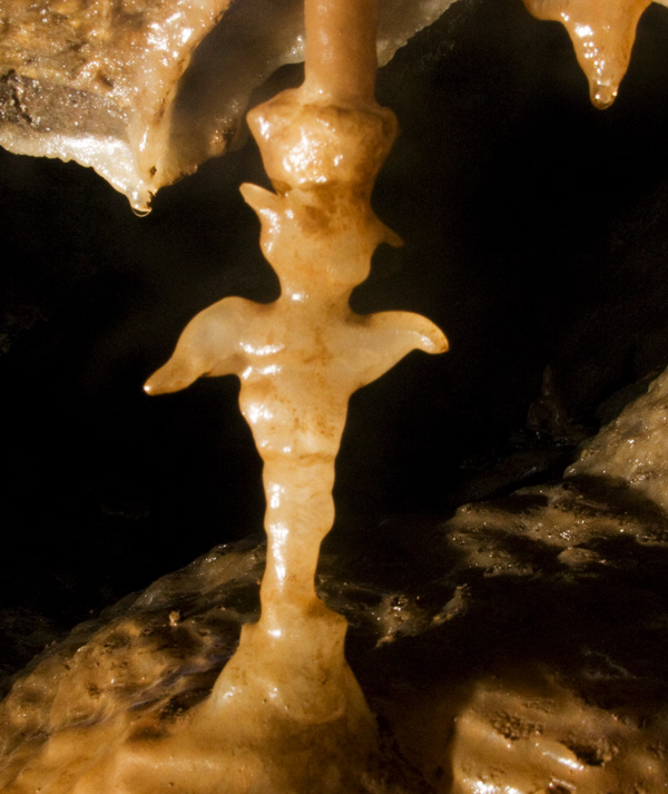 Humidity is constant and very high, usually between 98 and 100%. Near entrances with draughts it may drop to 75%, this is still much higher than the lowest levels recorded outside the cave. The draughts change direction depending on the outside weather. Air moving into the cave in winter may be at a lower temperature than the air in the cave - it will warm up and be able to hold its water vapour. In summer the air flowing into the cave cools down and becomes saturated with water vapour, it condenses on the walls and ceiling of the cave.