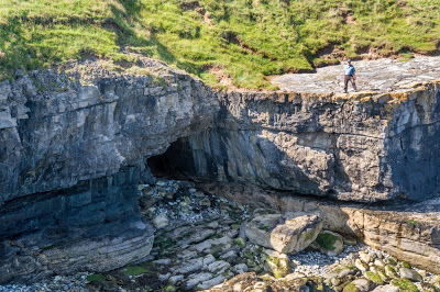 The most southerly of the Castell Mawr Caves is all that remains of a once longer cave. It is a 2m x 2m phreatic passage 4 metres in length passing through a quarried rock face, one entrance facing the sea. Although very short, the passage does contain undisturbed clay deposits. They do not however, appear to show any signs of archaeological potential without excavating.