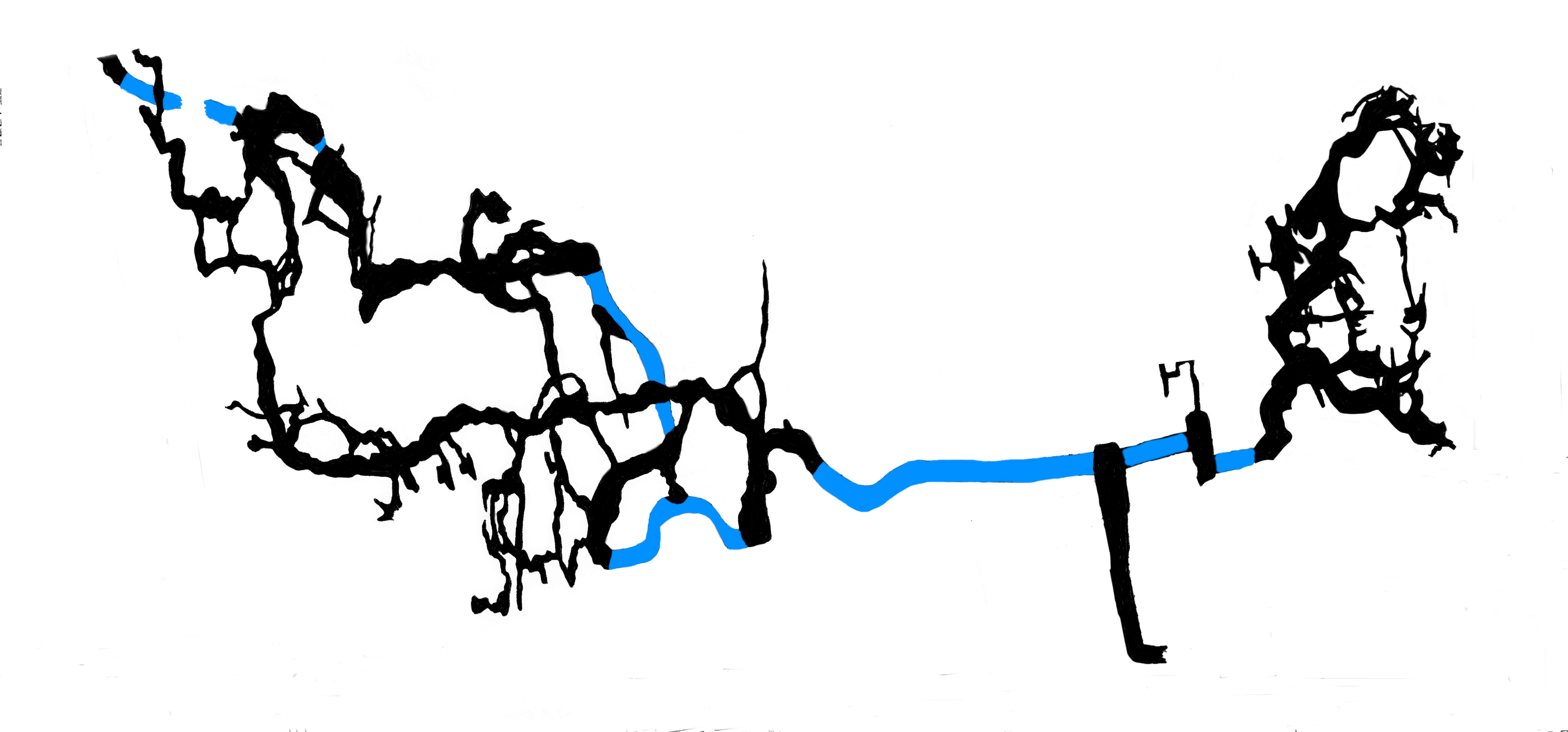 An extensive dry series opens on to 4 river chambers, which are part of the underground course of the River Loughour. Beyond the 4th River Chamber, about 125 metres of submerged passage has been explored by divers, ending in a low bedding plane.