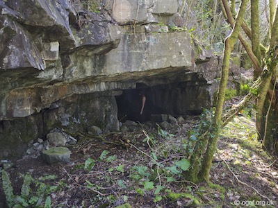 Situated in the same quarry workings as Crwbin Cave. From Pontyberem on the Llanelli to Carmarthen road, follow the road up the hill towards Carmarthen. On reaching the village of Crwbin take the small road on the left just a few metres past the village sign and in front of a bus shelter. Follow this road to a junction with another small road on the right and then follow this down a steep hill. At the bottom, the road bears around to the right and the ruins of an old chapel (Cape) Ddygen) covered in ivy can be seen in the field on the left-hand side of the road. Immediately opposite the ruins a rough track on the right leads into a quarry. Follow the track bearing left, past the first two faces, and then scramble up a grass bank on the right to a small terrace. In front of you is a clump of bushes and trees and the entrance to the cave is behind this under a wide overhang.