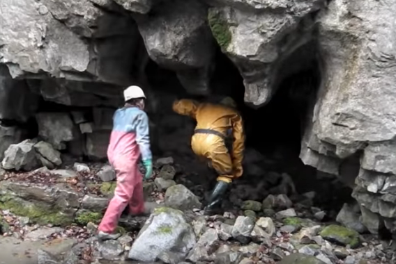 The cave is 140m downstream of Devil's Bridge. The entrance is low down on the right bank of the tributary which enters from the right.