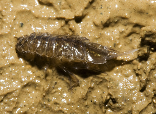 The freshwater hog lice (Asellus pp.) are aquatic creatures similar in appearance to woodlice and found in streams and ponds. Asellus meridianus has been found in Swildon’s Hole and unidentified Asellus have been recorded in Great Oones Hole and Stoke Lane Slocker. These specimens have no doubt been washed in from then surface. The one in the photograph is from the lake in Pen Park Hole.